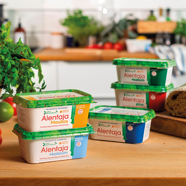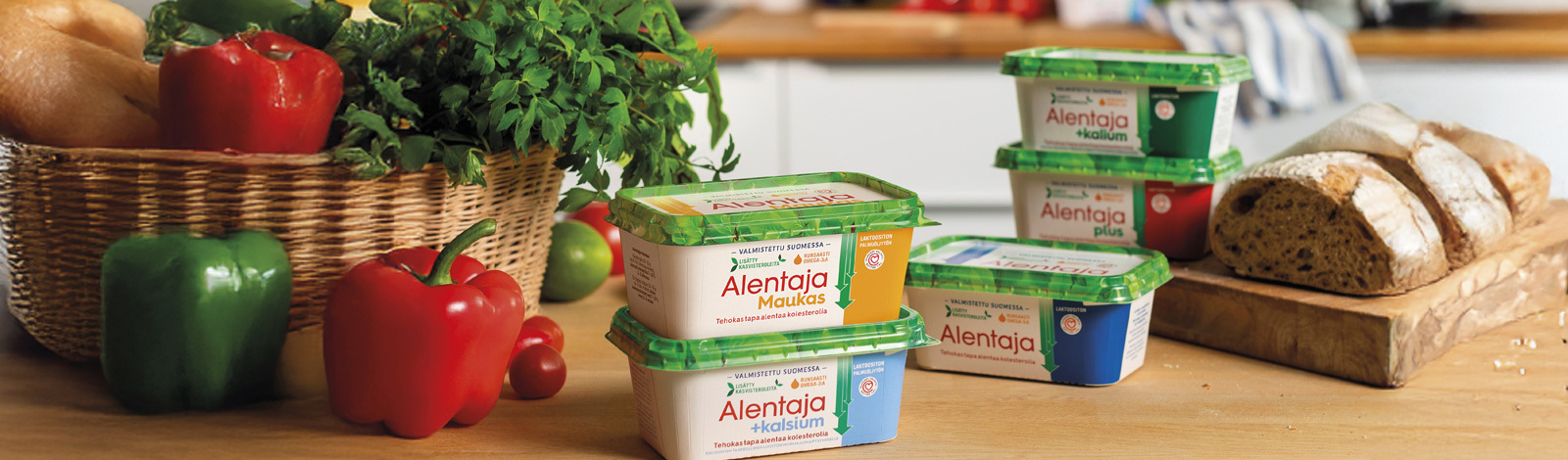 Suomen ostetuin kolesterolia alentava levite Alentaja* on Suomessa valmistettu rypsiöljypohjainen levite, johon on lisätty kasvisteroleita. Tuote on tarkoitettu sinulle, jonka veren kolesteroliarvot ovat suurentuneet. Kasvisterolien on tieteellisesti osoitettu säännöllisesti käytettynä ja yhdessä terveellisten elämäntapojen ja monipuolisen ruokavalion kanssa alentavan tehokkaasti veren haitallista LDL-kolesterolipitoisuutta jopa 7-12,5 % jo 2-3 viikossa. Kasvisterolit voivat pienentää myös veren kokonaiskolesterolia, mutta eivät vaikuta hyödylliseen HDL-kolesteroliin. Muistathan, että tuotteiden teho säilyy niin pitkään kuin tuotteita käytetään säännöllisesti.